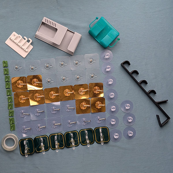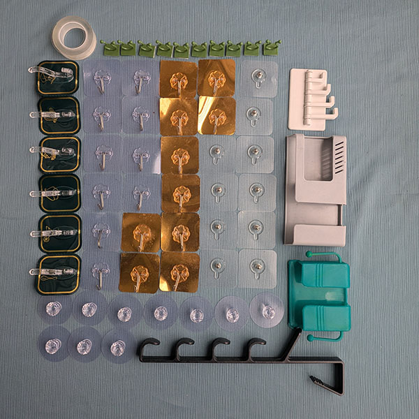 এতে বিভিন্ন ধরনের হুক, হোল্ডার, ক্লিপ ও টেপ দেওয়া আছে — যেমন দরজার হুক, ওয়াল হ্যাঙ্গার, ট্রান্সপারেন্ট হুক, প্ল্যান্ট ক্লিপ, ও ডাবল সাইড টেপ। সব মিলিয়ে ঘরের বিভিন্ন কাজে ব্যবহারযোগ্য একসাথে সবকিছু।